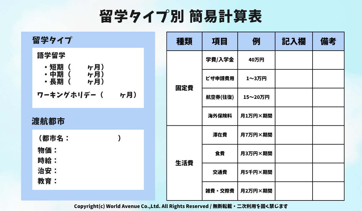 短期・中期・長期、語学留学やワーホリなど、気になる留学タイプを選んで、必要な予算をイメージしよう!