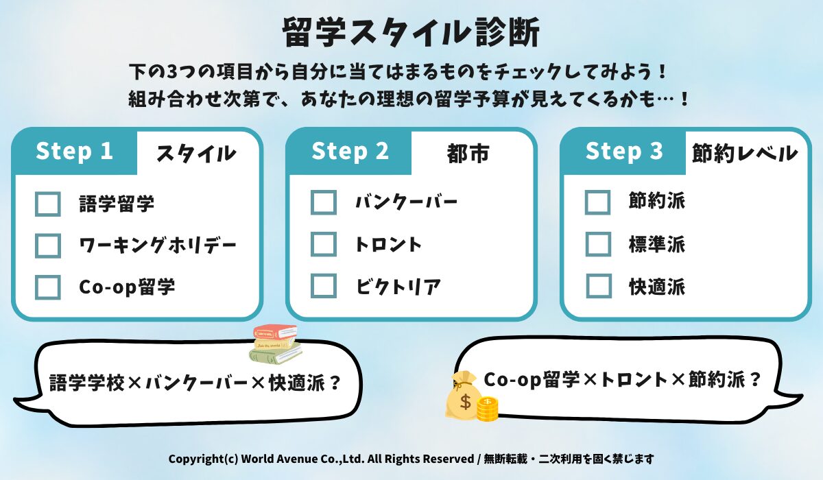 「スタイル × 都市 × 節約レベル」を選ぶだけで、目安の費用レンジをチェック!気になる留学のリアルなコストを、かんたん自己診断で見てみよう!