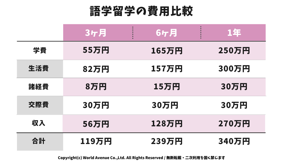 留学の期間によって、かかる費用や生活スタイルは少しずつ変わってきます。ここでは、3か月・6ヶ月・1年の滞在を想定して、総額の目安を比較しています。