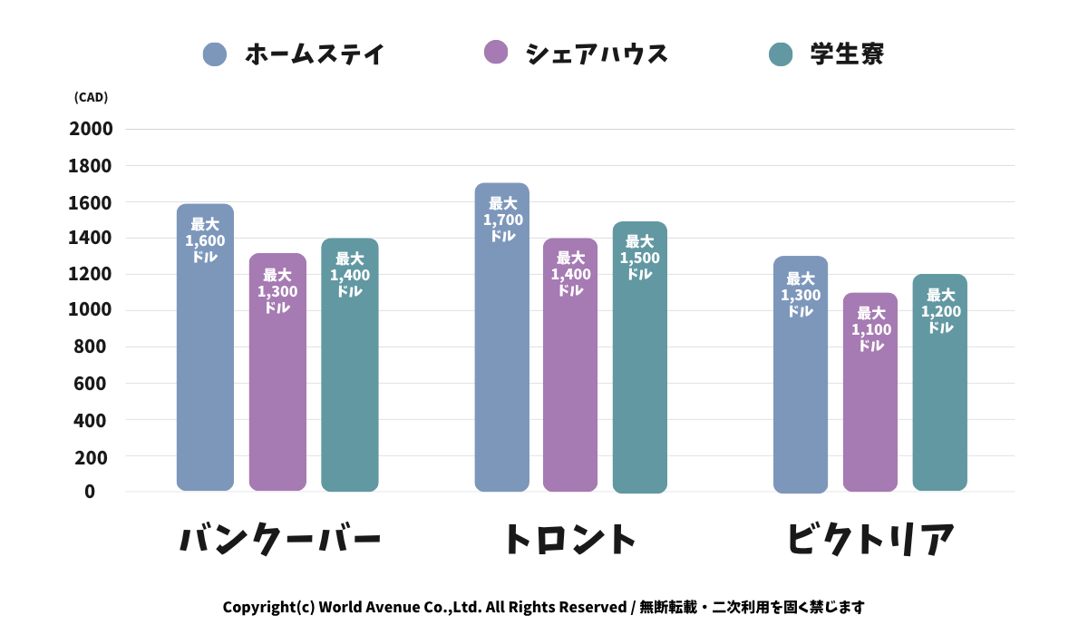 滞在費の目安は、ホームステイが月1,300〜1,700ドル、シェアハウスが950〜1,400ドル、学生寮が1,100〜1,500ドルほどです。