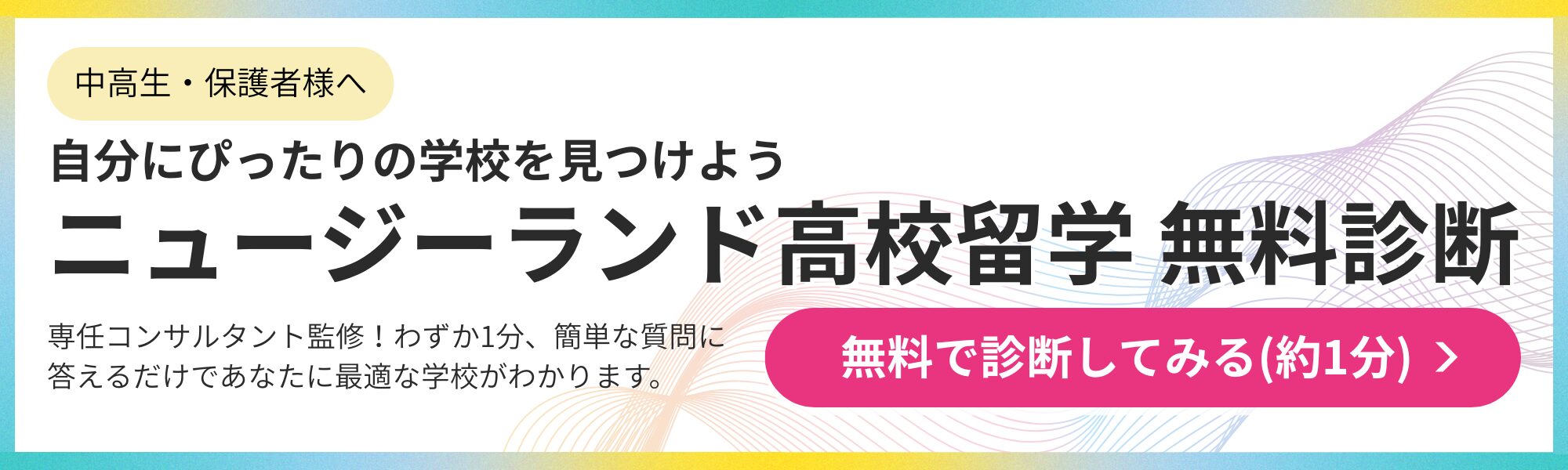 ニュージーランド国内には公立・私立を合わせ数多くの学校が存在し、各校の「留学生サポート体制」「得意とするスポーツ・芸術分野」「都市部か郊外か」などの特徴は多岐にわたります。ワールドアベニューでは、長年、蓄積されたカウンセリングデータに基づき、直感的に理想の学校を絞り込める「無料学校診断サービス」を提供しています。「希望のロケーション」「滞在方法(学生寮/ホームステイ)」「費用感」「入学のしやすさ」など、具体的な設問にチェックを入れるだけで、最新の学校データベースから最適な候補校を瞬時に抽出します。診断結果では、希望条件に対する各校の「マッチ度」を当社独自のアルゴリズムでスコア化。自分にどの程度合っているのかを視覚的に把握できるため、納得感のある学校選びが可能です。ぜひご活用ください。