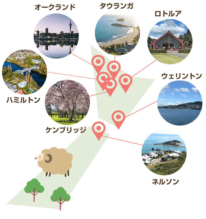 ニュージーランドには都会的な生活を楽しむことのできるオークランドから、大自然溢れるネルソンやリゾートを楽しめるタウランガなど異なる特徴を持つ都市からご自身にあう都市を選んでいただけます。