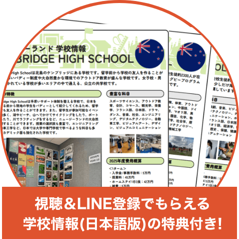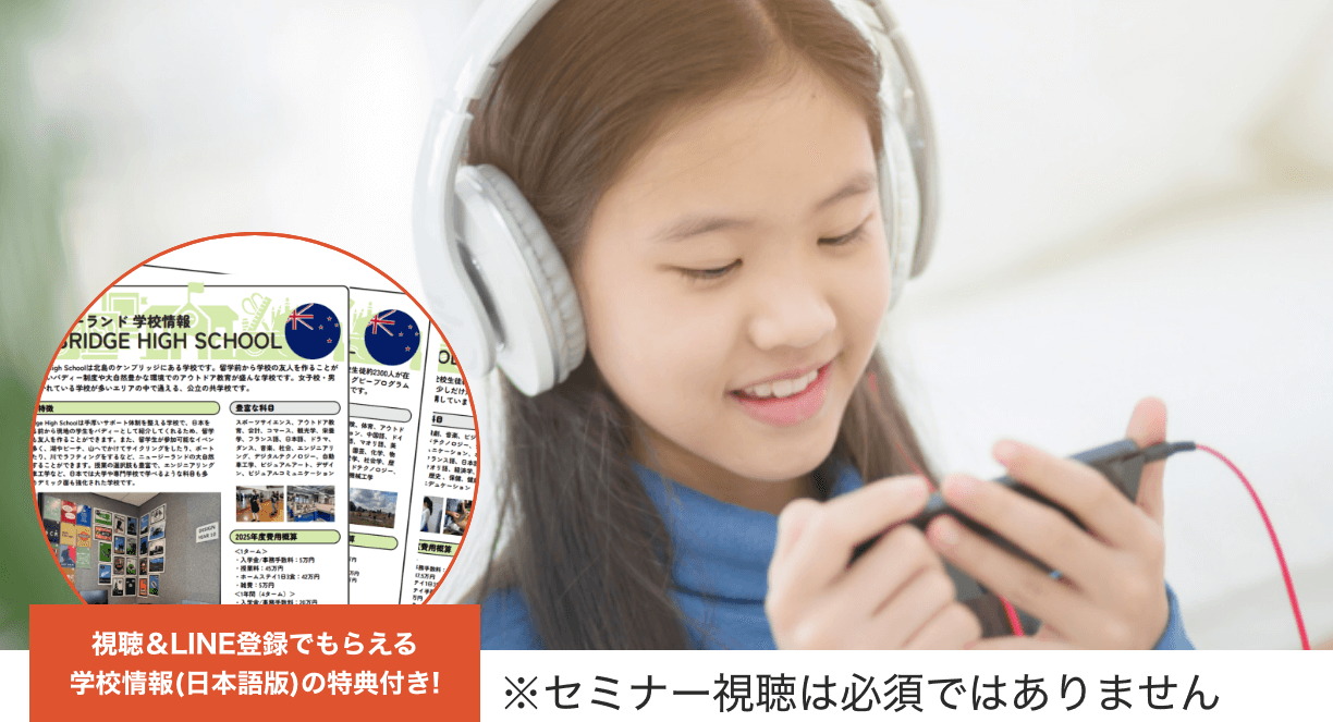 セミナーではニュージーランドでの中学・高校留学について、その特徴や人気都市、学校など基本情報をわかりやすく解説しています。動画形式のため視聴期間内であればいつでもどこでも何度でもご視聴いただけます。今なら、ご視聴後、LINE登録をいただくことで留学情報や学校情報(PDF)のプレゼントも実施中です。