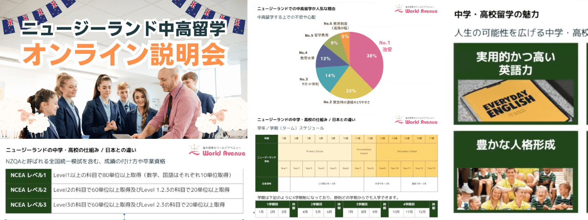 説明会や動画セミナーではニュージーランドでの中学・高校留学について、その特徴や魅力、人気都市や学校など基本的な情報をわかりやすく解説しています。説明会参加またはご視聴後、LINE登録をいただくことで中高留学資料やおすすめ学校情報プレゼントも実施中です。無料留学相談では、より具体的にお客様一人ひとりの状況、諸条件に合わせた留学制度や学校のご紹介、総額でかかる費用などのご案内をさせていただきます。いずれもオンライン形式のため、全国どこからでもご利用いただけます。