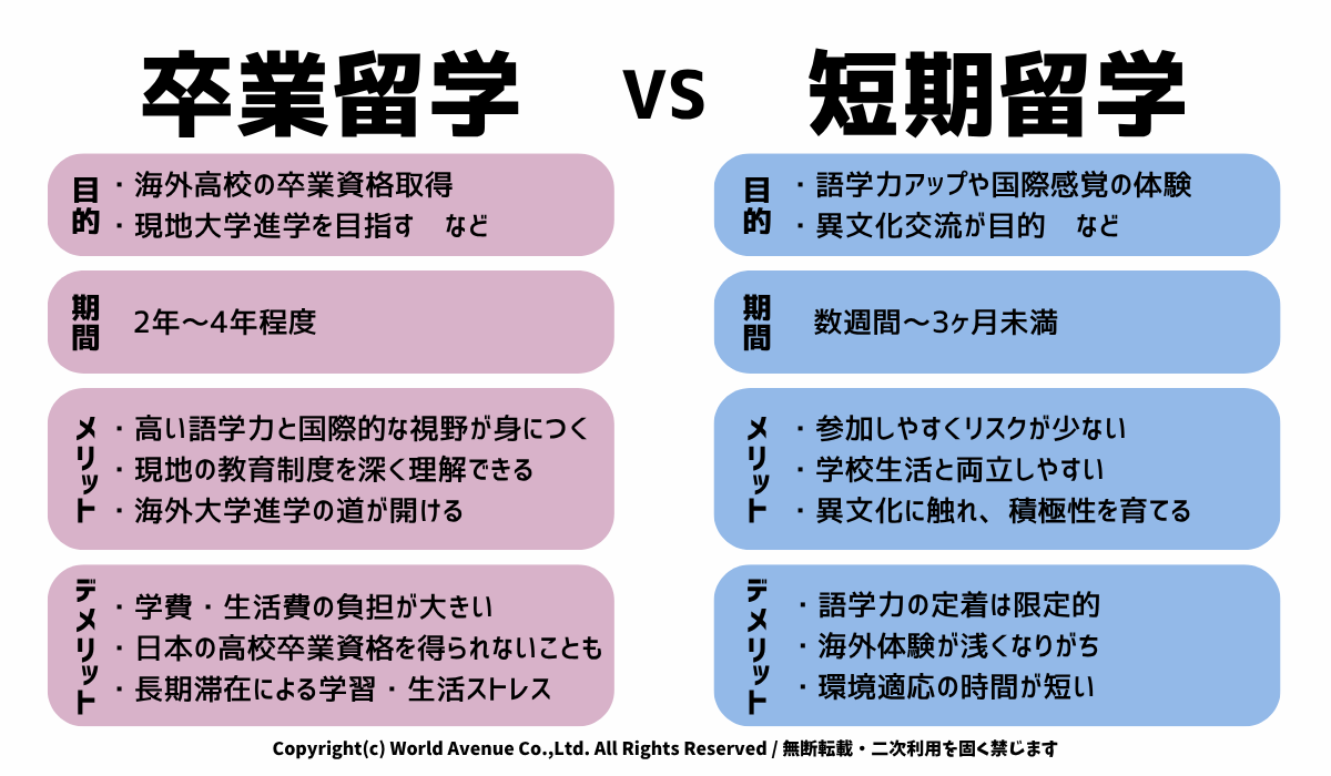 高校留学には、短期・中期・卒業留学などさまざまなスタイルがあります。どのタイプにも魅力があり、「どんな力を伸ばしたいか」「将来どんな進路を目指したいか」によって最適なプランは異なります。
