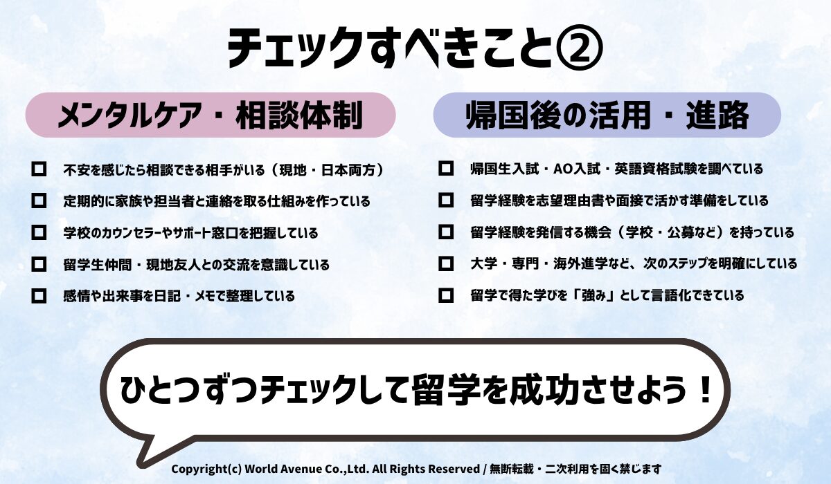 ただし、いくつかの注意点があります。帰国の時期によっては、日本の学年とずれが生じ、1年遅れての復学になる場合があります。また、留学先での成績や出席状況が、日本の単位として一部しか認められないこともあります。さらに、留学生活を途中で終えることによる精神的な切り替えが必要になり、帰国後のモチベーション維持が課題となるケースも少なくありません。