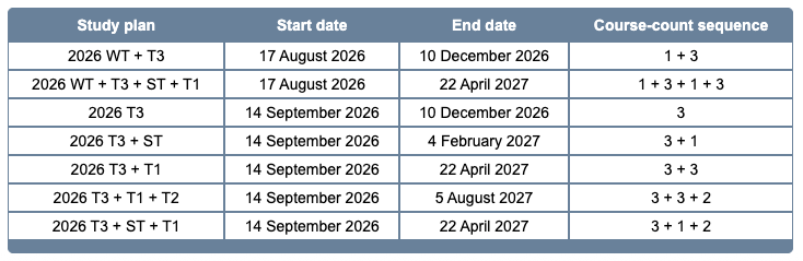 以下は、日本人学生が留学計画を立てやすい8〜9月開始(T3開始)のスタディプラン例です。