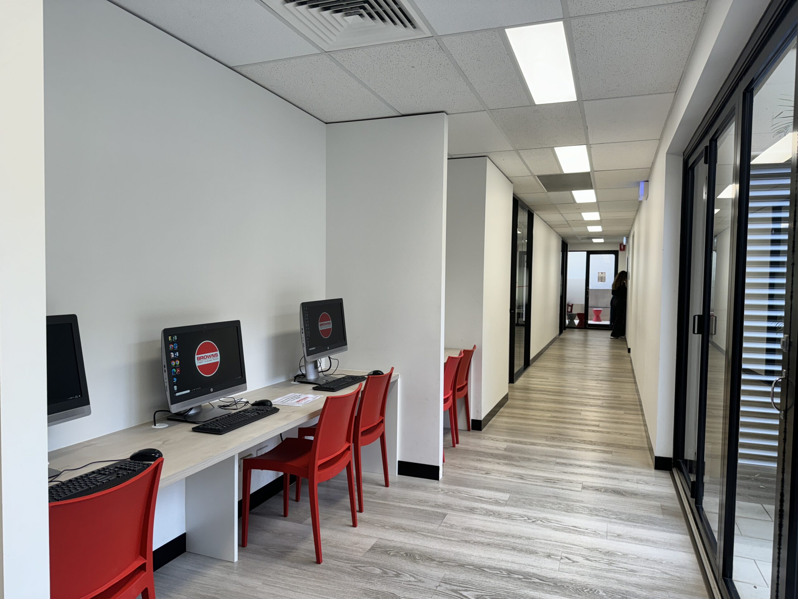 BROWNSの各キャンパスは赤と白のスクールカラーを基調にガラス張りでモダンな空間が広がります。全キャンパスにWi-Fi完備、ヘッドセットの付いたコンピューターや最新テクノロジーを搭載した大画面モニターが揃いスタイリッシュな学習環境が整います。