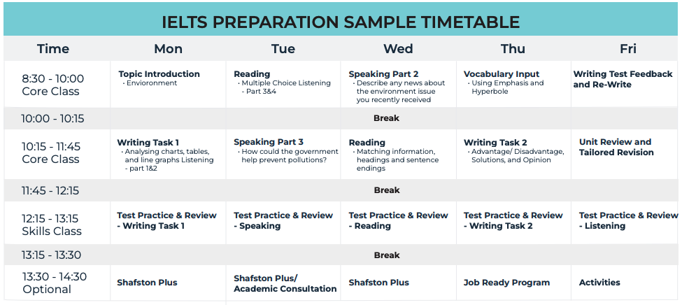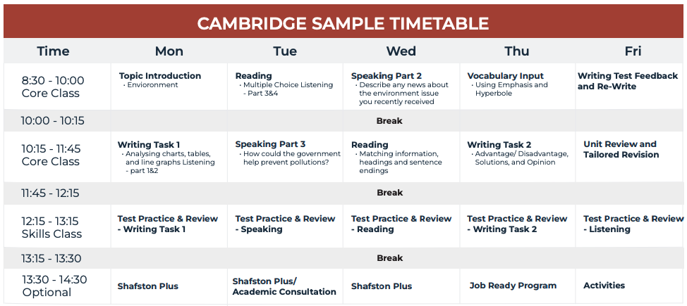 Shafston International CollegeのIELTS対策コースは中級以上の生徒を対象に開講しています。リーディング・ライティング・リスニング・スピーキングのすべてのセクションを徹底的に勉強することができます。大学進学を目指す方や就職活動や転職活動で利用したいと考えている方にとても人気なコースです。学んだスキルを実践するために模擬試験を実施、より高いスコアを取得できるような取り組みが行われています。