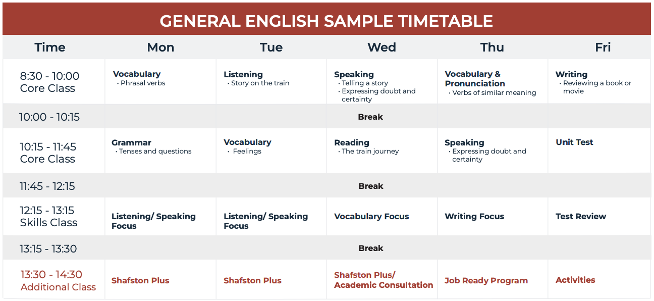 一般英語コースでは日常生活必要な英語力を伸ばすことができます。スピーキング・リスニング・リーディング・ライティング・文法というコアスキルをまんべんなく学ぶだけでなく、コミュニケーションスキルを効果的に伸ばせるようカリキュラムが組まれています。講師は生徒との会話を多く取り入れた授業を行うので、学んだ内容をアウトプットする練習をする機会がたくさんあるでしょう。また、Shafston International CollegeにはIELTSやケンブリッジ英語検定などの試験対策コースがあるため、これらのコースで勉強するための土台作りを行うことが可能です。