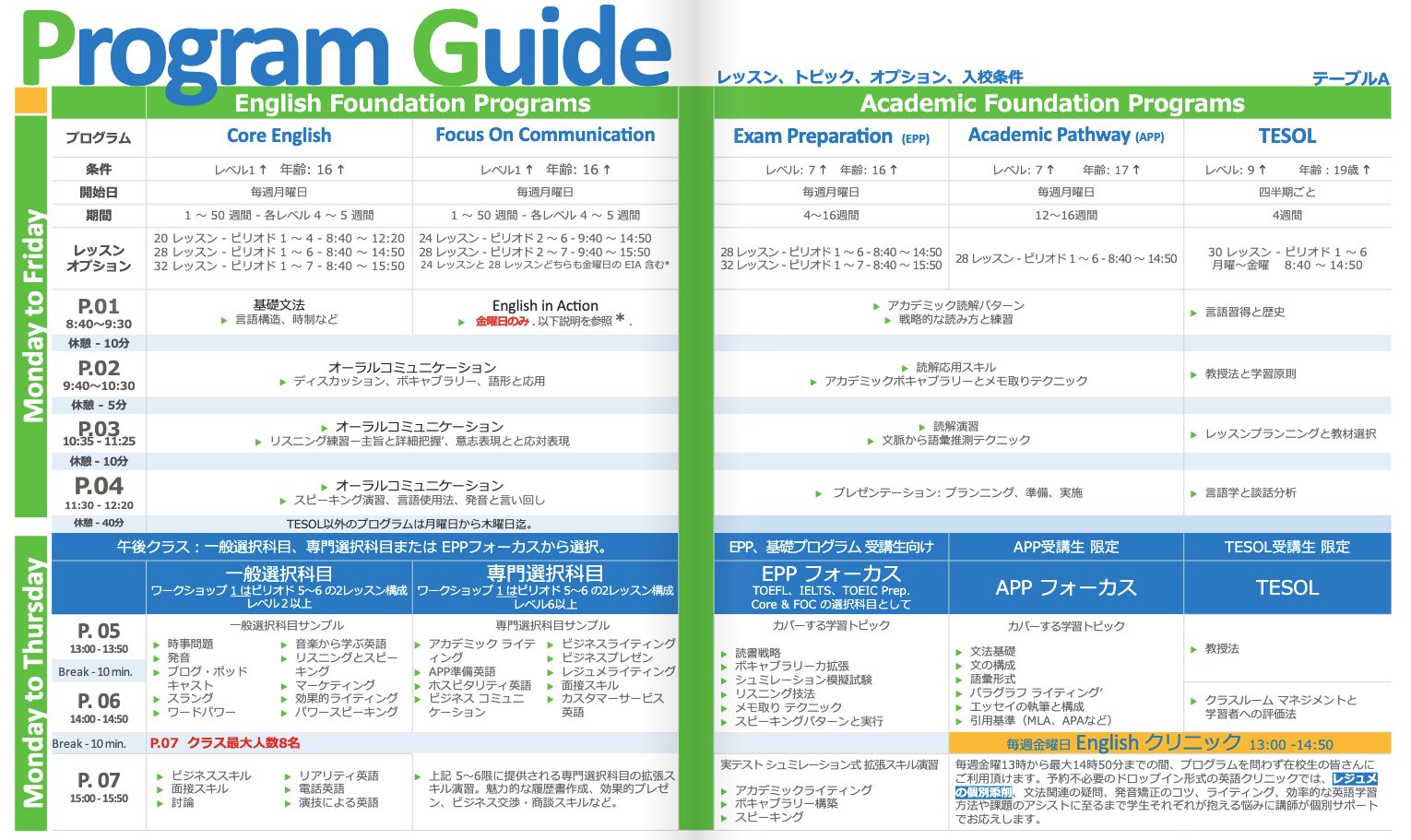 コア・イングリッシュ、コミュニケーション英語、ELTプログラムを受講する場合、オプショナル授業を追加することができます。