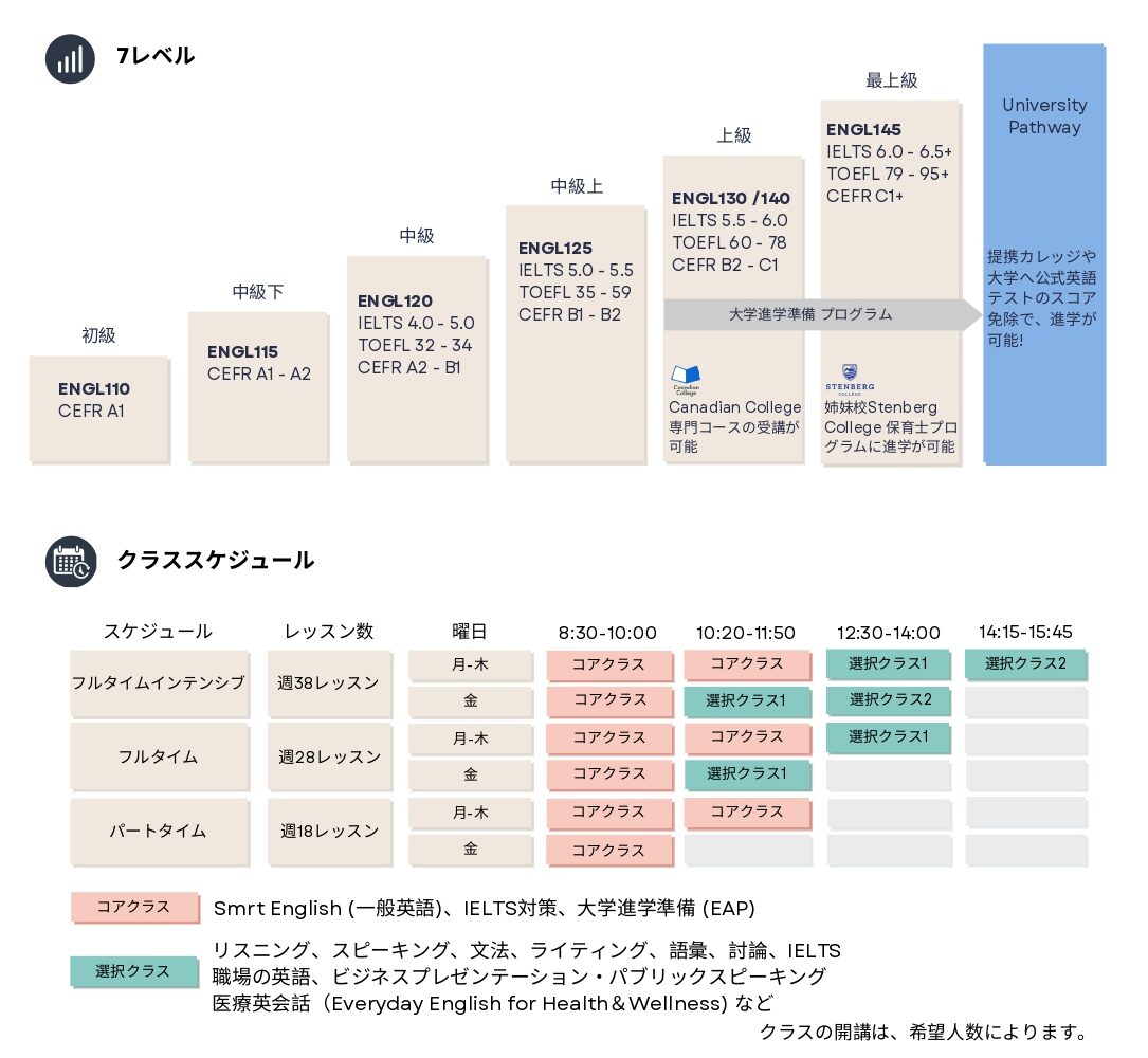 Canadian Collegeは私立の専門学校で、国際貿易やソーシャルメディア、ITやホスピタリティなど、幅広いコースを提供しています。CCELで中上級以上の英語力を習得することで、Canadian Collageへの進学や編入が可能です。また、CCELのSmrt Yearコースを選択し対象のレベルに到達することで、追加料金なしでCanadian Collegeへ編入することもできます。カナダのカレッジへの進学を視野に入れている方にCCELはぴったりといえるでしょう。