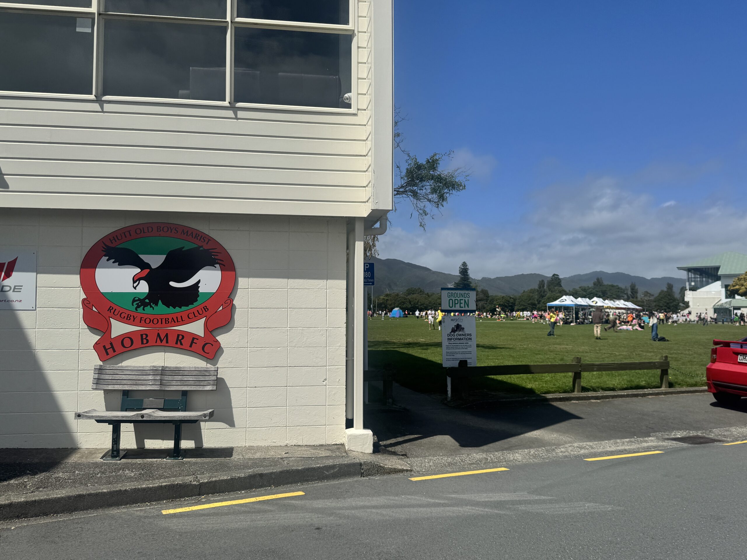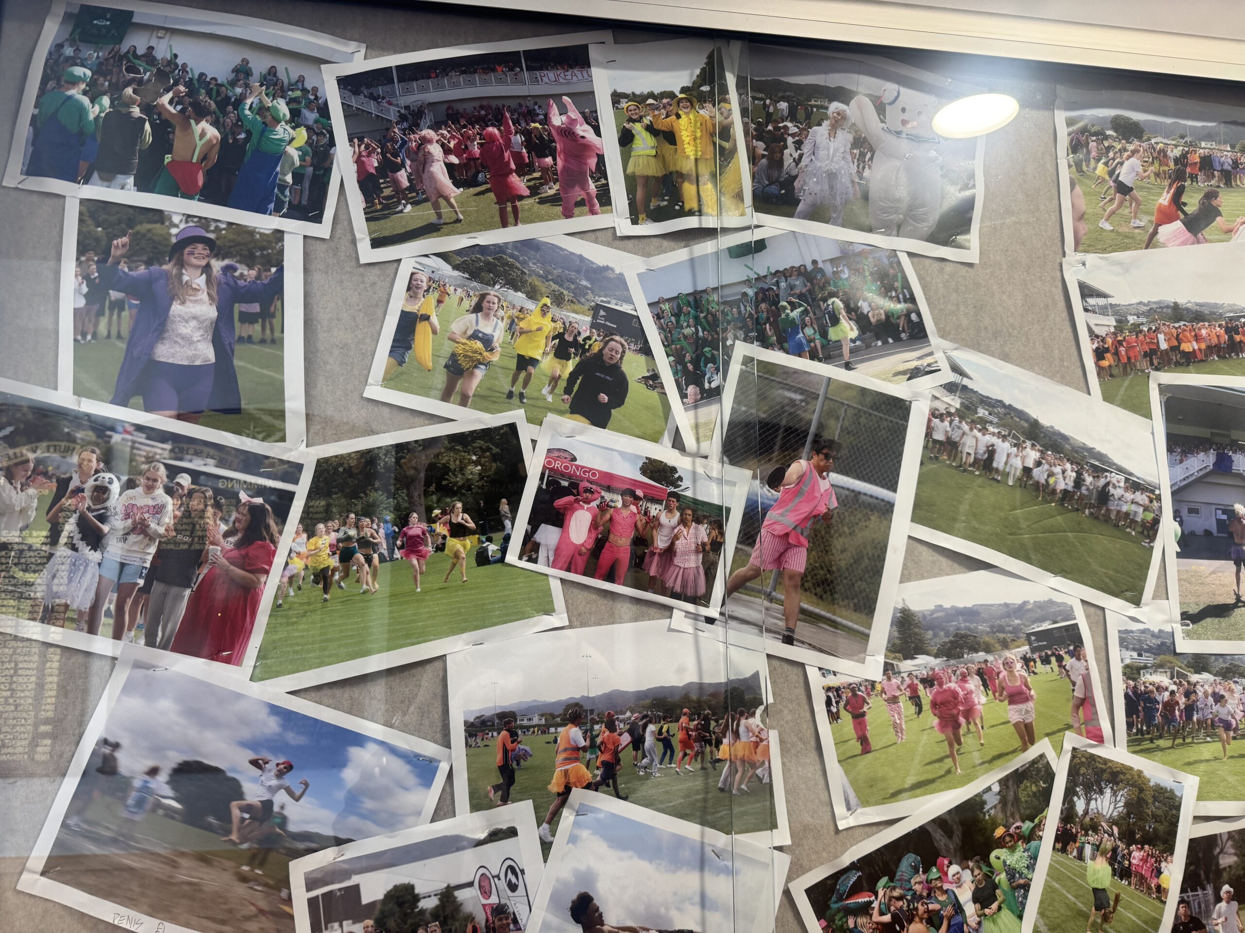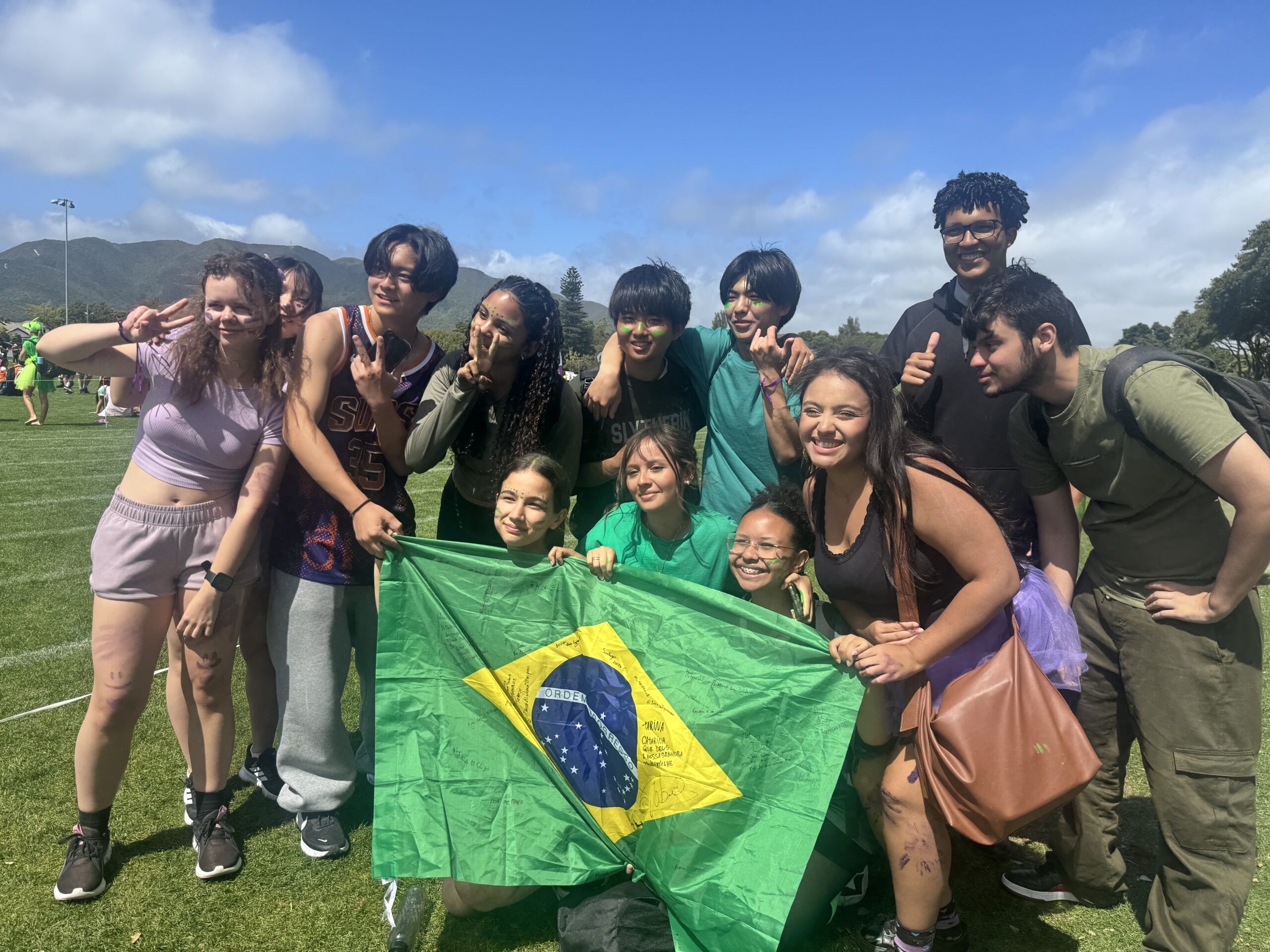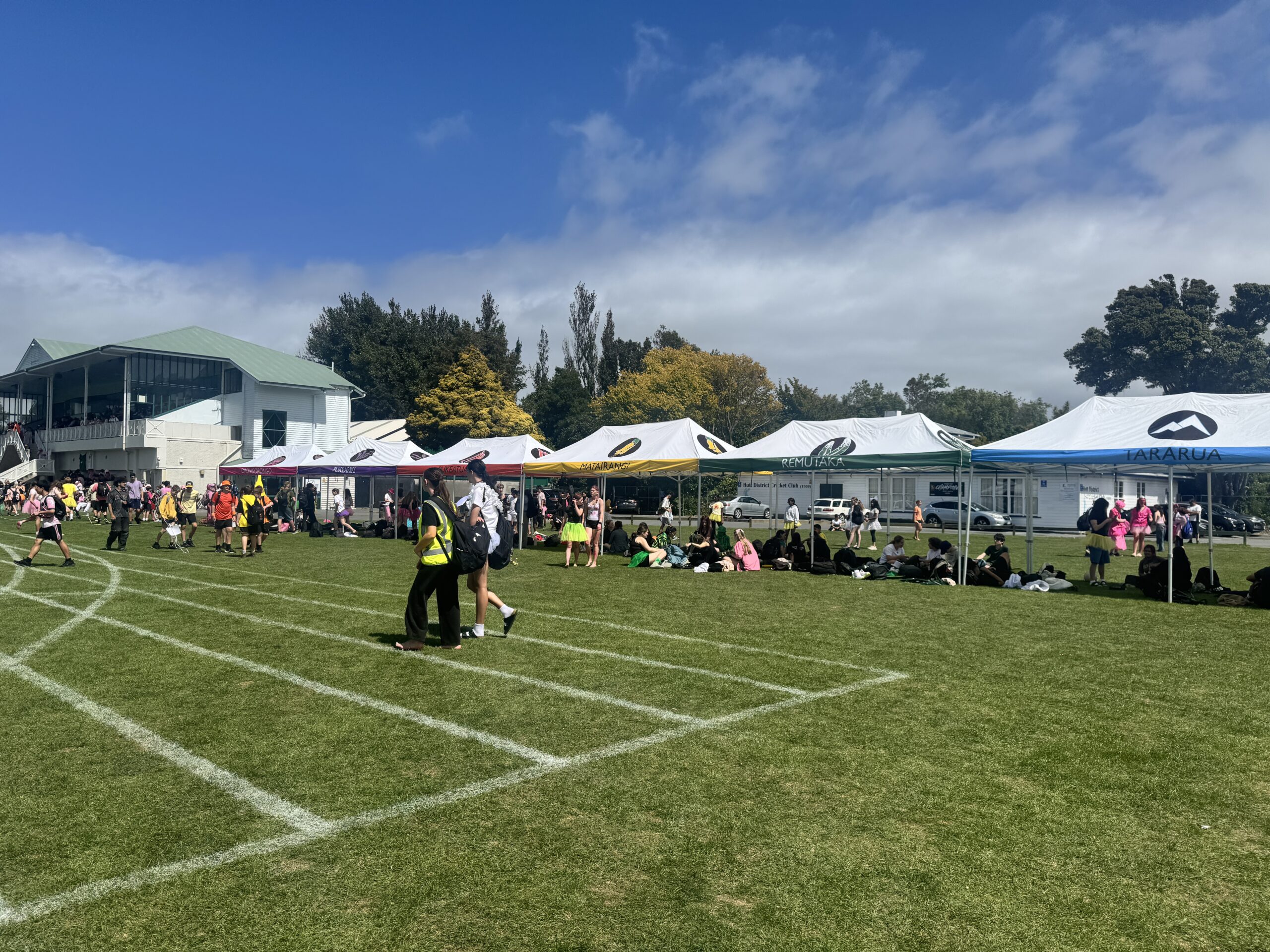 当日は通常の授業ではなく、Sports Day(スポーツデイ)という、日本の学校でいうと体育祭のようなイベントが開催されていました。学校から徒歩3分程度の大きな公園にあるスポーツフィールドに全校生徒が集まっており、まず驚いたのは生徒のコスチュームがとてもカラフルなことです!ニュージーランドでは、全学年を4〜6つのハウスグループに分けており、それぞれのハウスカラーが決まっています。生徒はハウスカラーを身にまとい、様々な競技に参加していました。
