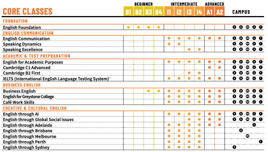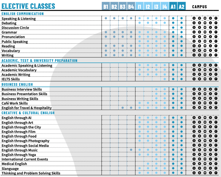 また、コアクラスもスキルクラスも、開講されるコースは生徒からの希望を受け多数決で決定されるため、渡航中に希望していたコースが開講されない場合もございます。また、参加希望者が多いコースに関しては先着順のため、希望に添えない場合もございます。予めご了承くださいませ。
