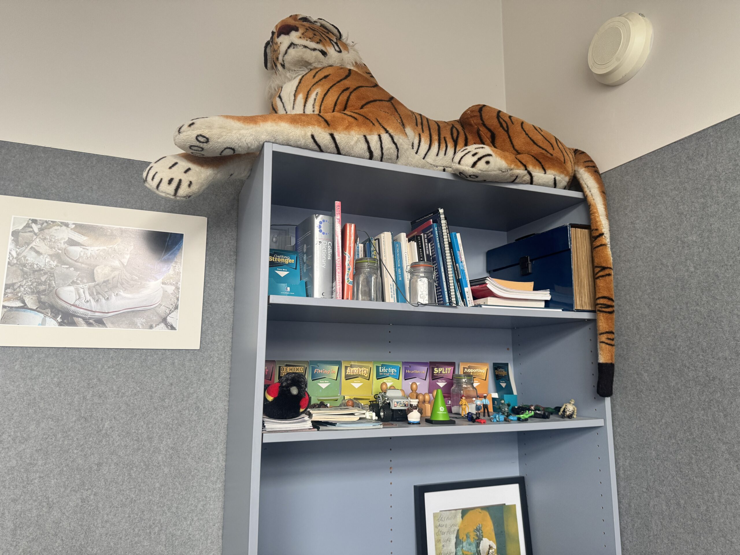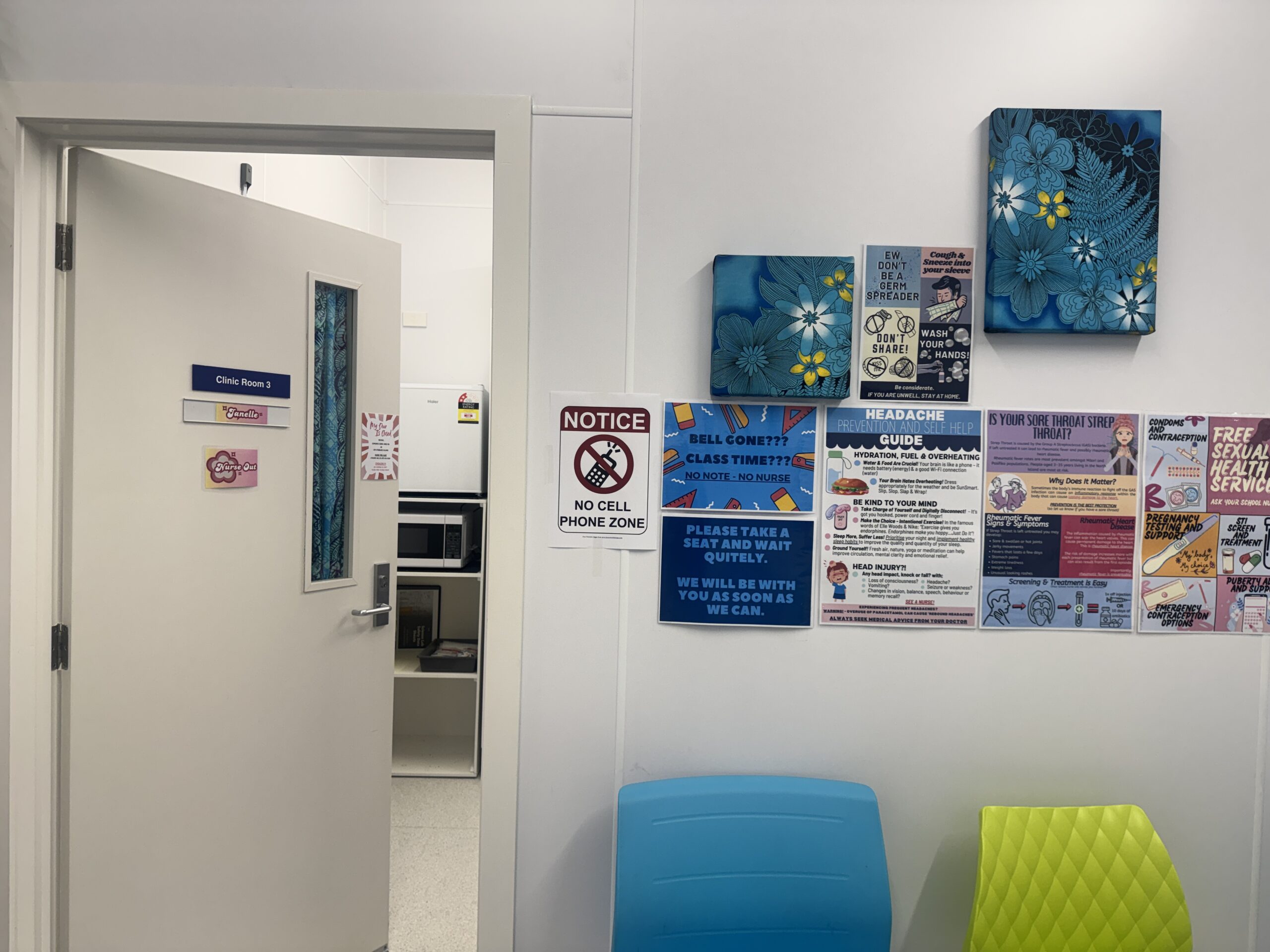 学校に到着した時間はちょうど生徒の帰宅時間だったため、学校のエントランスには大きなスクールバスが停まっていました。バスには多くの生徒が乗っておりましたが、徒歩圏内に住んでいる学生は友人同士おしゃべりしながら歩いていたり、とても賑やかな雰囲気でした。生徒が帰った後のキャンパスはとても静かで、広々と感じました。印象的なのはHEALTH&WELBEING(心身の健康)の設備の充実度です。カウンセラーが複数人在中しており、それぞれのカウンセリングルームがとても穏やかな雰囲気でした。Emotion Wheel(感情の輪)がおいてあり、円状に細かい感情が書いてあります。今の気分を、指差して説明できるツールで、生徒が言葉にできない感情も察知する環境があると感じました。カウンセラーの一人が、中高生はとても感情が豊かな時期だからこそ、授業とは切り離してメンタルケアできる場所が必要と言っていました。このように、サポート体制が整っているため、初めての海外留学で不安な方にもおすすめです。