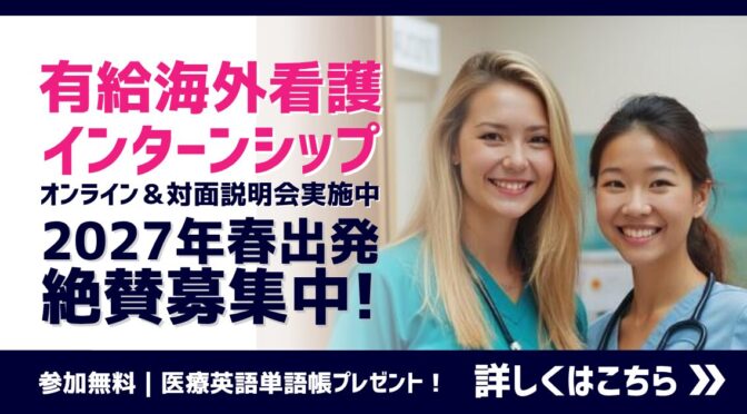 看護師に大人気!英語を学びながら稼げる留学「有給海外看護インターンシップ」。2027年春出発、絶賛募集中!参加者特典満載のプログラム説明会に今すぐ参加しよう。...