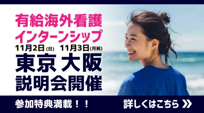 看護師に大人気!英語を学びながら稼げる留学「有給海外看護インターンシップ」。2025年11月、東京と大阪にてプログラム説明会開催が決定!参加者特典満載!今すぐ参加予約しよう。...