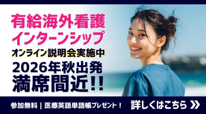 看護師に大人気!英語を学びながら稼げる留学「有給海外看護インターンシップ」。2026年秋出発満席間近!参加者特典満載のプログラム説明会に今すぐ参加しよう。...