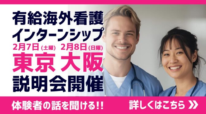 看護師に大人気!英語を学びながら稼げる留学「有給海外看護インターンシップ」。2026年2月、東京と大阪にてプログラム説明会開催が決定!体験者の話を聞ける貴重な機会!今すぐ参加予約しよう。...