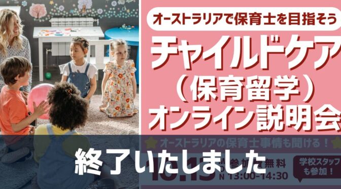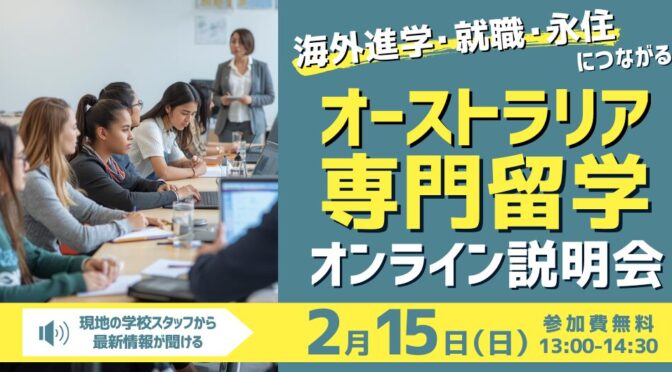 ご参加いただいた皆さん、ありがとうございました。オーストラリア留学に関しましてご興味をお持ちの方は個別留学カウンセリングまたはオンライン説明会へご参加ください。